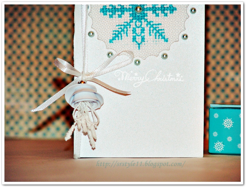 Used: Cross stitch snowflake on the material, pearls, ribbons, die cut rose, embellishments.